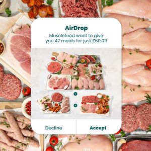 Questo template quadrato è pensato per promuovere un box di carne ad alto contenuto proteico, ideale per meal prep e acquisti in quantità. Il visual sfrutta un’idea molto riconoscibile: una finta notifica in stile “AirDrop” al centro di un collage full-bleed con petti di pollo, macinato, salsicce e tagli di maiale, arricchiti da erbe e pomodorini. Il grande riquadro bianco con angoli arrotondati concentra l’attenzione e rende il messaggio leggibile anche in feed, mentre la tipografia verde petrolio comunica pulizia e affidabilità (perfetta per brand grocery e fitness). La riga con il prezzo e il numero di pasti (“47 pasti a £60.01”) attiva subito i trigger di convenienza e abbondanza, ottimi in fase TOF per utenti ancora “unaware”. I pulsanti “Accept/Decline” trasformano l’offerta in una scelta rapida, quasi automatica, aumentando la propensione al click. Personalizzalo inserendo la tua griglia di prodotti, il prezzo per pasto e il nome del box/brand nel titolo della notifica.