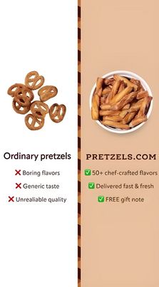 Questo template Story 9:16 è pensato per promuovere pretzel gourmet mettendo a confronto lo “snack qualunque” con un’alternativa premium curata da chef. Il design usa una divisione verticale netta: a sinistra un pannello bianco con un piccolo mucchio di pretzel e una lista di difetti con icone rosse a X; a destra uno sfondo beige caldo con una ciotola di pretzel stick e una lista di vantaggi con spunte verdi. La fascia centrale a righe aggiunge carattere senza appesantire, mantenendo la lettura rapidissima su mobile. La leva è tipica della fase di considerazione: il pubblico è già orientato alla soluzione (snack o regalo) e ha bisogno di motivi concreti per scegliere. I benefit sono immediati e “acquistabili”: tante varianti di gusto, consegna veloce e fresca, biglietto regalo incluso. Il codice colore rosso/verde accelera la decisione e rende il messaggio memorabile. È facile adattarlo sostituendo le foto, inserendo il tuo sito/brand e trasformando i bullet in prove specifiche (gusti stagionali, box regalo, opzioni senza glutine) mantenendo la struttura comparativa.