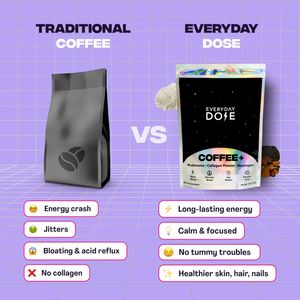 Questo template quadrato è pensato per un caffè funzionale “coffee+” o una miscela in bustina con ingredienti attivi, ideale per chi vuole conquistare chi oggi beve caffè tradizionale. La creatività funziona come un confronto diretto: a sinistra un sacchetto nero minimal con la scritta “Traditional Coffee”, a destra una busta premium con il prodotto, separati da un grande “VS”. Lo sfondo lavanda a griglia dà un look moderno e “scientifico”, mentre i titoli in maiuscolo, molto bold, rendono il messaggio immediato anche in scroll veloce. La parte bassa trasforma le obiezioni in una check-list decisionale. Nella colonna sinistra compaiono i problemi tipici (calo di energia, nervosismo, gonfiore/reflusso, niente collagene) e nella colonna destra i benefici equivalenti (energia più stabile, mente calma e concentrata, pancia ok, pelle/capelli/unghie più sani). È una struttura perfetta per la fase di considerazione: il pubblico è già “solution aware” e cerca il motivo concreto per cambiare. Personalizza sostituendo packshot, icone e claims con quelli della tua formula, mantenendo il layout speculare per massima chiarezza.