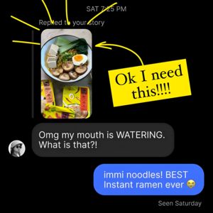 Questo template quadrato promuove ramen istantaneo/noodles pronti imitando una conversazione DM in risposta a una story: un modo credibile per trasformare una semplice menzione di prodotto in riprova ...