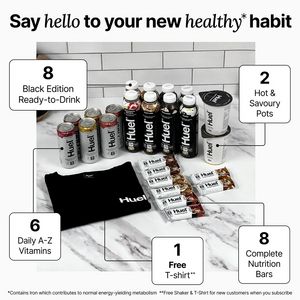 Questo template quadrato promuove un bundle “meal replacement” in versione assortita: ready‑to‑drink, barrette complete, pots caldi/salati e vitamine A‑Z, con incentivo “maglietta gratis”. Il visual è costruito come una vetrina ordinata: headline ampia e leggibile in alto (“Say hello to your new healthy* habit”) e, sotto, una foto in stile flat‑lay su piano in marmo con sfondo piastrellato da cucina—un contesto domestico credibile che comunica praticità quotidiana. I riquadri con numeri grandi e linee sottili che puntano ai prodotti funzionano da “scheda contenuto”: in un colpo d’occhio chiariscono quantità e varietà, riducendo dubbi e indecisione. La palette neutra (bianco/grigio con accenti neri) trasmette pulizia e affidabilità, perfetta per un messaggio health‑focused. A livello strategico è un creativo da consideration (MOF) per utenti già consapevoli della soluzione: risponde alla domanda “cosa include il kit?” e facilita la scelta. Basta sostituire foto, quantità e incentivo per adattarlo a trial box, abbonamenti o assortimenti stagionali.