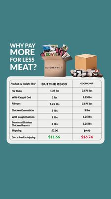 Questo template funziona perché unisce due leve tipiche della fase di considerazione: confronto e risparmio. Il titolo crea subito il frame (“stai pagando di più per avere meno”), poi la tabella porta la prova concreta: pesi, spedizione e soprattutto un unico indicatore finale (costo al chilo/libbra) che evita calcoli mentali. Su un pubblico solution-aware, già disponibile a comprare proteine surgelate/consegna a domicilio, il layout si comporta come una mini guida all’acquisto: risponde all’obiezione principale (il costo reale, spedizione inclusa) e aumenta la fiducia grazie alla trasparenza. L’evidenziazione verde vs rosso nella riga finale segue una gerarchia visiva efficace, portando l’occhio sul KPI decisivo e rendendo la scelta immediata. Le immagini delle box e dei tagli confezionati mantengono l’annuncio “concreto”, comunicando quantità e varietà oltre al prezzo.