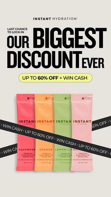 Questo template 9:16 in formato Story è pensato per brand di mix di elettroliti in polvere (stick monodose) e per promuovere pack assortiti di gusti. Il layout è pulito e molto “retail”: sfondo avorio, headline enorme in nero (“Our Biggest Discount Ever”) che occupa la parte alta e rende l’offerta impossibile da ignorare. Il messaggio chiave è concentrato in una pillola giallo lime (“Up to 60% off + win cash”), mentre due nastri diagonali neri con testo ripetuto creano effetto urgenza e rimarcano la promo come fosse un’etichetta da “super saldi”. In basso, la fila di quattro stick colorati (lampone, arancia, lemon‑lime e rosa chiaro) visualizza subito la varietà: perfetto per chi sta scegliendo quale gusto comprare o se prendere un bundle. È una creatività da fase decisionale (BOF) per un pubblico già “product aware”: meno spiegazioni, più incentivo. Personalizzabile cambiando percentuale, premio e gusti, sostituendo i pack con i tuoi e mantenendo contrasto tipografico e pillola evidenziata per una lettura immediata su mobile.
