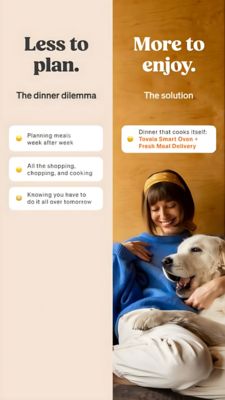 Questo template Story 9:16 è pensato per promuovere una soluzione “cena senza stress”, come un servizio di meal delivery con kit pronti da cucinare o un’offerta combinata con forno smart. La creatività gioca su un layout diviso in due: a sinistra un pannello beige pulito racconta il problema con tre card arrotondate in stile checklist; a destra un fondo caldo effetto legno introduce la soluzione, supportata da una foto lifestyle molto rassicurante. I titoli in serif, grandi e ad alto contrasto (“Less to plan.” / “More to enjoy.”), comunicano subito il beneficio, mentre i sottotitoli guidano la lettura (“il dilemma della cena” vs “la soluzione”). Il formato a punti rende immediati i pain point (pianificazione, spesa, preparazione), perfetto per una campagna TOF verso utenti “unaware” che non cercano attivamente ma riconoscono l’attrito quotidiano. L’immagine rilassata con il cane traduce visivamente l’upgrade di stile di vita: più tempo libero, meno carico mentale. Personalizza sostituendo i punti con le tue frizioni reali e inserendo nome offerta, area di consegna e USP in una card soluzione.