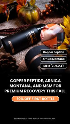 Questo template 9:16 in formato Story promuove una crema topica per il recupero muscolare con un posizionamento premium, perfetto per l’autunno. La creatività unisce un flat-lay stagionale (zucca, pigne, tessuti caldi e foglie dorate) a un flacone nero opaco dall’estetica “clinica ma luxury”, aumentando la percezione di qualità. L’inserto circolare con l’applicazione della crema sulla pelle chiarisce subito consistenza e utilizzo, riducendo frizioni per un pubblico già consapevole della soluzione. A destra, tre label in pillola con gli ingredienti (Copper Peptide, Arnica Montana, MSM) creano punti di prova rapidi da scorrere, mentre il titolo in maiuscolo lega formula e stagione (“premium recovery this fall”). Il bottone arancione “10% OFF FIRST BOTTLE” introduce lo sconto senza svalutare il brand, ideale per la fase di considerazione dove si confrontano formule e affidabilità. Il pannello nero con testo bianco garantisce leggibilità su mobile. Il template si personalizza facilmente sostituendo ingredienti, styling stagionale e offerta (bundle, abbonamento, edizione limitata) mantenendo un tono scientifico e di fascia alta.