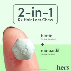 Questo template quadrato è pensato per promuovere un chew orale contro la caduta dei capelli, presentato come soluzione “2-in-1”. L’impatto visivo è pulito e clinico: sfondo verde menta, cornice sottile con angoli arrotondati e headline grande in sans-serif (“2‑in‑1 Rx Hair Loss Chew”) che comunica subito il beneficio. A sinistra, un dettaglio macro del prodotto appoggiato sulla punta di un dito rende immediata l’idea di formato, dimensione e praticità. A destra, la struttura a elenco (“biotin + minoxidil”) spiega la logica della formula in modo semplice, perfetto per un pubblico già orientato alla soluzione e in fase di confronto. Il minimalismo riduce lo sforzo cognitivo ma lascia informazioni utili alla decisione, tipiche del mid‑funnel. È facile adattarlo cambiando coppia di attivi, colore/forma del chew e logo in basso a destra. In più, puoi inserire dose, prezzo in abbonamento o una nota clinica mantenendo l’estetica medicale.