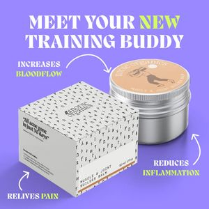 Questo template quadrato è pensato per promuovere un balsamo per supporto muscolare e articolare, presentato come un vero “compagno di allenamento”. Il visual punta su uno sfondo viola/lavanda pieno e su una tipografia serif d’impatto: headline grandi in bianco con accenti verde lime che evidenziano parole chiave e guidano la lettura veloce. In basso domina un packshot realistico (scatola + barattolino) con ombra morbida che aggiunge profondità, mentre frecce curve e callout collegano subito i benefici al prodotto. Le tre promesse—allevia il dolore, aumenta il flusso sanguigno, riduce l’infiammazione—sono hook rapidi e “scorrevoli”, perfetti per un pubblico top-of-funnel ancora poco consapevole della soluzione. Funziona perché trasforma l’esigenza di recupero in risultati concreti e posiziona il balm come step semplice post-workout. È facile personalizzarlo sostituendo colori, benefit (in modo compliant), inserendo un badge promo e una CTA chiara senza rompere la gerarchia pulita.