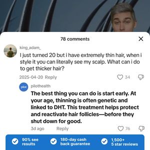 Funziona perché combina fiducia e sollievo: parte da un commento realistico (“vedo il cuoio capelluto”) e prosegue con una risposta sicura che cita un meccanismo concreto (DHT), comunicando autorevolezza “clinica”. Con pubblico già consapevole delle soluzioni e in fase di considerazione, la specificità riduce la paura di incappare in promesse vuote e spinge sull’urgenza positiva dell’intervento precoce. La fascia finale concentra tre potenti riduttori di rischio—risultati quantificati, garanzia lunga e molte recensioni 5 stelle—rendendo la scelta più sicura senza bisogno di toni aggressivi. L’interfaccia da commenti sembra contenuto organico e trasferisce la credibilità della conversazione tra utenti, mantenendo però il controllo del messaggio. In sintesi: hook sul problema, spiegazione del “perché” e prova sociale ben visibile.