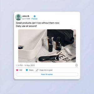 Questo template quadrato è pensato per promuovere un kit di grooming maschile trasformando l’annuncio in un post “reale” e credibile. Su uno sfondo azzurro-grigio molto tenue compare una card con angoli arrotondati in stile social: in alto un breve commento entusiasta in prima persona, sotto una foto lifestyle pulita di prodotti da cura personale appoggiati su un piano in marmo vicino al lavandino. Si vedono un trimmer, due flaconi e una borsa da toilette, elementi che richiamano subito la routine quotidiana in bagno. L’impatto visivo è minimal e ordinato: packaging scuro, luce morbida e tanto spazio bianco per far risaltare il prodotto. Le micro-informazioni dell’interfaccia (avatar, timestamp, like e risposte) funzionano come leva di riprova sociale e accendono curiosità, perfette per la fase TOF e per utenti “non consapevoli”. Personalizza sostituendo la foto con il tuo set, riscrivendo la recensione in base al benefit principale (rapidità, precisione, delicatezza) e calibrando i numeri di engagement in modo coerente con il tuo brand.