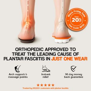 Questa creatività funziona perché combina in modo molto efficace tre leve per un pubblico solution-aware in fase di considerazione: sollievo, fiducia e urgenza. L’area arrossata sul tallone aggancia subito chi soffre del problema, mentre il piede appoggiato sul plantare rende visibile il “come funziona” (supporto dell’arco e correzione). La promessa “approvato” alza la percezione di autorevolezza, e la garanzia 90 giorni riduce il rischio percepito, elemento decisivo quando si confrontano plantari simili. Stelline e “200.000+ clienti” aggiungono riprova sociale rapida e leggibile. Infine, il bollino Black Friday con codice crea un motivo immediato per acquistare adesso, mantenendo la comunicazione essenziale: visual forte, headline unica, tre benefit scansionabili.
