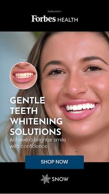 Questo template è efficace in fase di considerazione perché unisce prova di trasformazione e autorevolezza. Il richiamo visivo prima/dopo in formato circolare permette di “verificare” il risultato in un istante, perfetto per utenti solution-aware che vogliono evidenze rapide. La fascia “Featured in Forbes Health” introduce una scorciatoia di credibilità esterna e abbassa lo scetticismo tipico delle promesse di sbiancamento. Il frame nero con testo bianco, insieme ai toni naturali della pelle, comunica pulizia e sicurezza; l’headline unica (“Gentle…”) affronta l’obiezione principale—la sensibilità—senza appesantire di dettagli. La CTA grande e ben contrastata in basso segue le best practice mobile e guida all’acquisto quando la fiducia è stata costruita.
