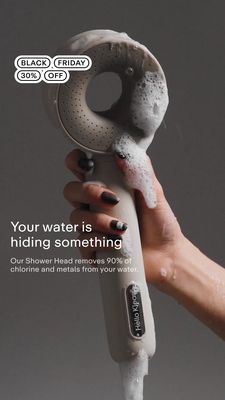 Questo template Story 9:16 mette al centro un soffione doccia filtrante con un close‑up molto “real”: una mano impugna il doccino grigio chiaro mentre la schiuma si appoggia sulla testina, su sfondo bagno grigio antracite. Il testo bianco, pulito e moderno, è posizionato in basso a sinistra: apre con un gancio di curiosità (“Your water is hiding something”) e subito dopo spiega il beneficio con un dato concreto (rimozione del 90% di cloro e metalli). In alto a sinistra compaiono badge a pillola “BLACK FRIDAY” e “30% OFF”, leggibili e ordinati. È una creatività pensata per TOF awareness e per chi non sa di avere un problema: prima crea dubbio e attenzione, poi collega il tema a pulizia e benessere con una promessa facile da capire. La palette neutra e il contrasto alto funzionano benissimo su mobile. Si personalizza sostituendo percentuale e claim, aggiungendo una riga su test di laboratorio/certificazioni e inserendo il proprio marchio sulla targhetta del manico, mantenendo però l’effetto “in uso” che aumenta fiducia.