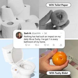 Questo template quadrato è pensato per promuovere una doccia bidet/attacco bidet come “must-have” per l’igiene in bagno. Il layout è un collage 2x2: in alto a sinistra rotoli di carta igienica, in alto a destra la comparazione con etichetta “With Toilet Paper”; in basso a destra un frutto sciacquato con etichetta “With Tushy Bidet”, affiancato in basso a sinistra da una foto pulita del WC. Al centro si sovrappone una card in stile tweet con recensione, perfetta per portare riprova sociale senza appesantire la grafica. La palette neutra e “pulita” (bianchi e grigi chiari con un accento arancione) trasmette ordine e igiene, mentre le etichette guidano subito la logica problema/soluzione. Funziona in TOF (awareness) con pubblico ancora “non consapevole”, perché la metafora visiva incuriosisce e rende il tema memorabile. Personalizza cambiando brand, caption di confronto e inserendo una recensione reale (famiglie, affittuari, eco-consapevoli) mantenendo il collage per una lettura immediata nel feed.