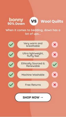 Questo template Story 9:16 è pensato per brand di biancheria da letto che vogliono promuovere un piumino in piuma mettendolo a confronto, in modo immediato, con le trapunte in lana. Il visual lavora s...