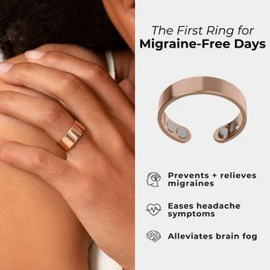 Questo template quadrato promuove un anello wearable “wellness” presentato come soluzione per il sollievo dall’emicrania. Il design è costruito su uno split pulito: a sinistra una foto lifestyle ravvi...