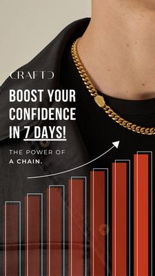 Questo template Story 9:16 è pensato per promuovere una catena d’oro da uomo come upgrade di stile capace di aumentare rapidamente sicurezza e presenza. L’impostazione è estremamente “hero”: foto lifestyle ravvicinata su collo e torace con t-shirt nera, così la maglia a grana grossa resta il punto focale. A sinistra, una tipografia bold e condensata in maiuscolo spinge una promessa diretta (“Boost your confidence in 7 days!”), mentre il nome brand in alto (stile minimal) dà autorevolezza. Nella parte bassa entra un elemento intelligente: un grafico a barre in tonalità rosso/ruggine che cresce verso destra con freccia ascendente. È una metafora visiva di miglioramento, status e “level up”, facile da capire in un secondo. A livello marketing è perfetto per TOF awareness su pubblico ancora non consapevole: non parla subito di dettagli tecnici, ma del risultato desiderato (fiducia, carisma). Personalizzalo cambiando il numero di giorni, i colori delle barre e la catena mostrata per differenziare linee basic vs premium.