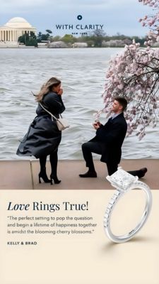 Questo template in formato Story 9:16 è pensato per pubblicizzare un anello di fidanzamento con diamante puntando su una scena di proposta dal forte impatto emotivo. La metà superiore è una foto lifestyle a tutta pagina: lui in ginocchio con la scatolina dell’anello sullo sfondo di acqua calma e fiori di ciliegio rosa, un contesto subito associato a romanticismo e “momento irripetibile”. In alto, logo e nome brand in stile minimale danno un tono premium senza rubare la scena. Nella parte bassa compare un pannello beige caldo dedicato al testo: headline in serif elegante (“Love Rings True!”) e una frase in stile citazione, utile per storytelling e riprova sociale leggera (nomi come firma). L’anello in grande, sovrapposto al pannello, riporta l’attenzione sul prodotto e facilita la memorizzazione. È ideale per TOF awareness: prima vende l’emozione (aspirazione, regalo, amore), poi rende concreto l’acquisto. Personalizza location, fioritura e citazione per stagioni, collezioni e campagne “proposal destination”.