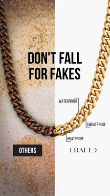 Questo template 9:16 in formato Story è pensato per vendere una collana a catena color oro puntando su un confronto immediato tra qualità autentica e imitazioni. Il design è uno split-screen molto netto: a sinistra una catena scura e arrugginita su una texture “pietra” con etichetta “OTHERS”; a destra uno sfondo bianco pulito con una catena dorata lucida e tre callout di performance (waterproof, sweatproof, heatproof) che comunicano resistenza e valore premium in un colpo d’occhio. Il titolo “DON’T FALL FOR FAKES” in font alto e compresso funziona da gancio forte, con tono di avvertimento e autorevolezza—perfetto per pubblico top-of-funnel ancora “unaware” su placcature, ossidazione e tenuta nell’uso quotidiano. La leva principale è la fiducia: prima la prova visiva, poi pochi benefit facili da scansionare, così cala lo scetticismo e cresce l’intenzione. Personalizza cambiando modello di catena, adattando i tre claim ai tuoi materiali e sostituendo il wordmark con il tuo brand, mantenendo il contrasto per una lettura istantanea.