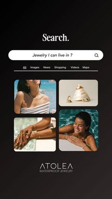 Questo template 9:16 in formato Story promuove gioielli waterproof “da tutti i giorni” usando un’idea creativa molto riconoscibile: la schermata di ricerca. Su uno sfondo nero/ardesia, un titolo serif (“Search.”) e una barra di ricerca grande e arrotondata con la query “Jewelry I can live in ?” trasformano subito il beneficio in linguaggio quotidiano: gioielli che puoi tenere addosso tra mare, piscina e doccia. Una riga di categorie stile motore di ricerca consolida l’effetto “sto cercando la soluzione”, poi la parte visual esplode in un collage 2x2 con angoli arrotondati: scatti lifestyle al sole con collane e bracciali in acqua, dettagli di mani con anelli e un still-life prodotto su tonalità sabbia. Il contrasto tra oro caldo e azzurri dell’acqua dà un look premium e vacanziero, senza sovraccaricare di testo. È perfetto per awareness (TOF) e pubblico “unaware”: la curiosità della ricerca aggancia, mentre le foto raccontano desiderio e praticità. Personalizza la query, sostituisci i quattro riquadri con la tua collezione e aggiorna il lockup finale con il tuo sistema logo.