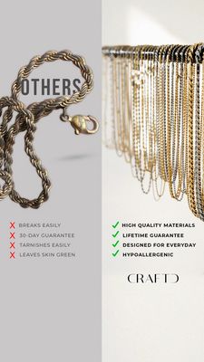 Funziona perché trasforma promesse generiche (“alta qualità”) in un verdetto immediato: X rosse sui problemi tipici dei gioielli economici e spunte verdi sui vantaggi del brand. Il contrasto rende la lettura velocissima su mobile e affronta le obiezioni più comuni della categoria (ossidazione, rotture, reazioni cutanee). Su un pubblico product-aware in fase di considerazione, la checklist dà le conferme necessarie per scegliere un venditore rispetto a un altro, mentre “garanzia a vita” è una potente leva di riduzione del rischio e fiducia. La foto luminosa con più catene sulla destra comunica artigianalità e ampia scelta, aumentando il valore percepito e la propensione all’acquisto, soprattutto in retargeting e contesti di confronto.