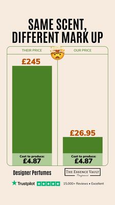 Questo template 9:16 in formato Story è pensato per brand di profumi che vogliono vendere sul valore. Il titolo in maiuscolo (“Same scent, different mark up”) cattura l’attenzione subito e prepara il terreno al confronto: al centro c’è un grafico a due colonne che rende evidente la differenza di prezzo, con una barra verde molto alta per “their price” e una più bassa per “our price”. In basso, la stessa “cost to produce” su entrambi i lati crea l’effetto shock e fa scattare la domanda: “Sto pagando solo il ricarico?”. L’emoji stupita sopra la linea di separazione aumenta curiosità e indignazione, perfetto per un pubblico TOF a livello “unaware” che non sta ancora cercando un profumo. Il design è pulito e leggibile su mobile: sfondo beige caldo, verdi pieni per le barre e prezzi in arancione ad alto contrasto. La fascia finale con stelle, recensioni e “Excellent” aggiunge riprova sociale immediata. Personalizza con i tuoi prezzi, un confronto realistico e il tuo marchio.