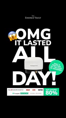 Questo template Story 9:16 è pensato per sponsorizzare un profumo “dupe” o un’eau de parfum economica ma con resa da boutique. L’impostazione è ultra pulita: sfondo nero pieno e tipografia bianca gigantesca in maiuscolo (“OMG IT LASTED ALL DAY!”) che occupa quasi tutto lo schermo e cattura subito l’attenzione. La foto del flacone è al centro e si sovrappone al testo, creando una gerarchia chiara e premium; l’emoji stupita aggiunge un gancio emotivo immediato. A destra, un badge verde evidenzia il vantaggio prezzo (“solo una frazione del costo dei designer”), mentre la barra in basso concentra riprove: testate, stelle in stile Trustpilot, numero elevato di recensioni e un riquadro “AVG SAVING 80%”. A livello strategico lavora in piena fase di considerazione: il pubblico è già “solution-aware” e cerca un’alternativa ai profumi di marca. Il mix di sorpresa + durata + risparmio riduce lo scetticismo e aumenta l’intenzione d’acquisto. Personalizzazione rapida: cambia flacone, percentuale di risparmio e sostituisci le prove con le tue citazioni stampa o rating reali mantenendo il contrasto forte.