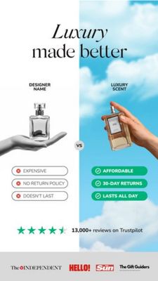 Funziona perché trasforma la fase di considerazione in una scelta immediata, usando un confronto ad alto contrasto. Il frame rosso/verde con X e spunte, più il badge “VS”, rende evidente il tema convenienza/valore e aiuta un pubblico già “solution‑aware” a giustificare il passaggio dal designer a un’alternativa. La riduzione del rischio è chiarissima (resi 30 giorni), un punto decisivo nei profumi dove l’acquisto “a scatola chiusa” crea esitazione. La riprova sociale (fila di 5 stelle e “13.000+ recensioni su Trustpilot”) fornisce validazione terza in un colpo d’occhio, aumentando fiducia e credibilità. Infine, il titolo in serif preserva l’aura premium, mentre le pillole sintetiche rendono i benefit leggibili in pochi secondi: aspirazione + prova razionale nello stesso layout.