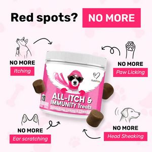 Questo template quadrato per il pet-care è pensato per promuovere snack masticabili/supplementi per cani orientati a pelle e immunità, trasformando un sintomo comune in una promessa immediata. La struttura parte da una domanda di dolore (“Red spots?”) e la chiude con un riquadro fucsia “NO MORE” che posiziona il prodotto come soluzione. Al centro domina il barattolo inclinato di “All‑Itch & Immunity Treats”, mentre i cubetti della formulazione “treat” sono in primo piano per rendere chiaro il formato. Intorno, icone illustrate a mano (orecchio, zampa, profilo del cane) e frecce curve creano un percorso circolare che elenca quattro benefici concreti: basta prurito, leccamento delle zampe, grattarsi le orecchie e scuotere la testa. Lo sfondo rosa chiaro con pattern di zampette mantiene un tono rassicurante; il testo nero e i box fucsia garantiscono contrasto e leggibilità. A livello di strategia usa problem-solution, promessa di sollievo e segnali di affidabilità (pulizia visiva, hero product), perfetto per un pubblico in fase di considerazione già “solution aware”. È facile personalizzarlo sostituendo sintomi, colore accento e label per campagne stagionali o varianti di formula.