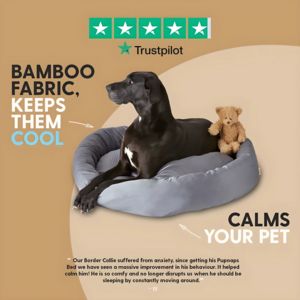 Questo template quadrato per il settore pets è pensato per promuovere una cuccia rinfrescante e calmante in tessuto di bambù. La grafica punta su un look pulito e “domestico”: sfondo beige caldo, una forma morbida in sovrapposizione che incornicia la scena e una grande foto lifestyle con un cane disteso su una cuccia grigia a ciambella. Le frecce bianche guidano l’occhio verso i benefit, mentre la tipografia è molto leggibile e a contrasto (nero e bianco); la parola “COOL” in azzurro rende immediata l’idea di freschezza. In alto, la fascia con 5 stelle in stile Trustpilot crea riprova sociale istantanea; in basso, una recensione lunga aggiunge dettaglio e riduce l’incertezza tipica della fase di considerazione. Funziona con proprietari già “solution-aware” che stanno confrontando soluzioni per caldo, comfort e ansia: promessa chiara + prova reale. Personalizza razza, claim e recensione mantenendo la stessa gerarchia visiva.