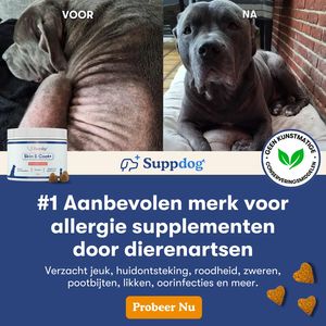 Questo template quadrato per integratori pet punta tutto su una trasformazione prima/dopo della cute e del pelo del cane. Nella metà superiore c’è una foto divisa in due: a sinistra la pelle appare irritata e arrossata (“VOOR”), a destra il cane sembra più sereno e con un aspetto più uniforme (“NA”). È una prova visiva immediata. Una fascia beige centrale ospita il nome del brand e il packshot del barattolo, mentre un bollino rotondo “senza conservanti artificiali” rafforza la percezione di sicurezza. La parte inferiore, in blu navy, usa un headline grande in bianco ad alta leggibilità, seguito da un elenco di sintomi e da un pulsante CTA arancione molto evidente. A livello strategico è perfetto per la fase di considerazione: parla a proprietari già consapevoli della soluzione, combinando trasformazione (risultati), fiducia (impostazione “consigliato da veterinari”) e sollievo (prurito/infiammazione) per abbassare le resistenze e favorire il click. È facile da adattare cambiando foto, claim e lista benefici mantenendo il contrasto che funziona nello scroll.