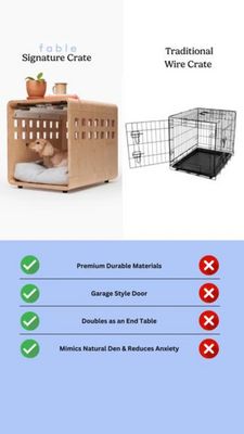 Questo template funziona perché sfrutta il confronto diretto, ideale per utenti “solution-aware” che hanno già deciso di usare una crate e stanno scegliendo quale acquistare. La foto ambientata come arredo comunica subito “premium” e “sta bene in casa”, mentre la wire crate crea un contrasto che fa percepire l’opzione tradizionale come fredda e ingombrante. La tabella con spunte verdi e X rosse trasforma i claim in criteri di valutazione, riducendo lo sforzo cognitivo su mobile e rispondendo alle obiezioni principali (materiali, estetica, comfort/riduzione ansia). In fase di considerazione, è un mini “buyer guide” visivo: argomenta l’upgrade con poche righe, rispettando best practice di prova visiva, leggibilità e gerarchia chiara dei benefit.