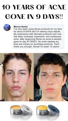 Questo template in formato 9:16 è pensato per promuovere un trattamento anti-acne o una routine topica con risultati rapidi e ben visibili. La struttura apre con un headline enorme in maiuscolo (“10 YEARS OF ACNE GONE IN 9 DAYS!!”) che blocca lo scroll, poi passa subito alla riprova con una card stile screenshot: icona profilo, nome e recensione lunga. È una scelta perfetta per la fase di considerazione, quando chi soffre di brufoli sta confrontando soluzioni e vuole “prove vere”. Al centro, il prima/dopo è diviso in due scatti dello stesso volto maschile; le linee tratteggiate evidenziano le zone critiche e rendono il miglioramento immediatamente leggibile su mobile. In basso, due vasetti metallici di crema/balsamo danno concretezza al prodotto e aumentano la percezione di affidabilità. Lo sfondo bianco, il nero ad alto contrasto e le sezioni pulite mantengono il messaggio chiarissimo. Puoi personalizzare promessa, testo recensione, aree evidenziate e inserire packshot, logo e CTA del tuo brand.