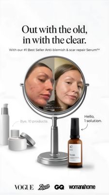Questo template 9:16 in formato Story è pensato per promuovere un siero anti-imperfezioni e riparatore per cicatrici, presentato come “un’unica soluzione” per pelli a tendenza acneica. Il design è super pulito: sfondo bianco, headline in serif nera dallo stile editoriale e, al centro, uno specchio da tavolo che incornicia un confronto prima/dopo molto chiaro—la trasformazione si capisce in un secondo. In basso, i packshot completano la narrazione: vasetto skincare minimal a sinistra e flacone ambrato del siero a destra, con micro-callout in stile handwriting (“Addio, 10 prodotti.” / “Ciao, 1 soluzione.”) che enfatizzano semplicità e routine ridotta. Le logotype tipo rivista in fondo aggiungono riprova sociale, mentre la riga “#1 Best Seller” dà credibilità a chi è in fase di considerazione e sta valutando alternative. Funziona perché elimina attriti: un messaggio forte, una prova visiva, un prodotto. Personalizza inserendo un vero prima/dopo cliente, adeguando claim e proof (best seller, test, risultati), sostituendo i loghi con le tue uscite stampa e armonizzando i colori dei packshot con la tua brand identity mantenendo l’estetica minimal e premium.