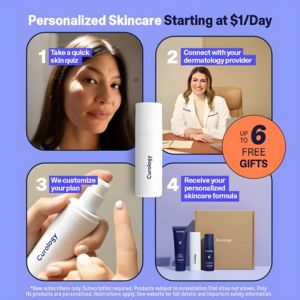 Questo template quadrato è pensato per promuovere una skincare personalizzata in abbonamento, con un percorso guidato che unisce onboarding digitale e supporto dermatologico. Il layout è una griglia 2x2 che racconta in modo immediato 4 passaggi: (1) quiz veloce sulla pelle con ritratto in primo piano, (2) consulto con professionista in ambulatorio, (3) personalizzazione del piano con dettaglio del dosatore e della quantità, (4) ricezione del kit completo in box. Al centro, un flacone verticale fa da “ancora” visiva e aumenta la memorabilità del prodotto; il badge arancione “fino a 6 regali” aggiunge un forte driver di valore. Sfondo pervinca, cornici arrotondate e blocchi tipografici sans-serif rendono il messaggio pulito, moderno e rassicurante. A livello strategico lavora nel mid-funnel (consideration) su utenti già solution-aware: chiarisce come funziona, alza la fiducia con l’autorità del medico e riduce le frizioni grazie a step semplici e al price anchor (“da $1/giorno”). È facile adattarlo cambiando step, incentivo e packshot per acne, macchie o anti-età.