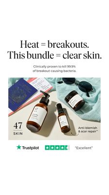 Questo template 9:16 in stile Story promuove un bundle skincare anti-imperfezioni pensato per il caldo: il headline mette subito a fuoco il problema (“Heat = breakouts”) e lo risolve con una promessa ...