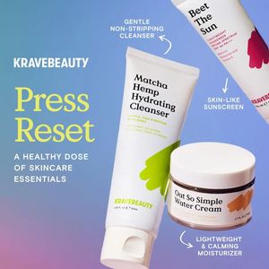 Questo template funziona perché vende prima di tutto una sensazione: “Press Reset” trasforma la skincare in un gesto di ripartenza, attivando i trigger di self-care e rinnovamento—ideali per un pubblico “unaware” che non sta cercando un prodotto specifico. Il bundle di essenziali riduce la fatica decisionale: detergente + solare + idratante è una routine immediata e “completa”, che aumenta la percezione di valore e abbassa la soglia di prova verso un nuovo brand. Le frecce con callout rendono i benefit leggibili in pochi secondi, perfetti per la fruizione rapida in feed. Sfumatura pulita, tanto respiro e tipografia semplice comunicano delicatezza e affidabilità, segnali cruciali per chi teme irritazioni. In sintesi: una promessa forte, pack ben visibili e ruoli dei prodotti chiari, senza sovraccaricare di claim o prezzo—perfetto per la fase awareness.