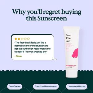 Questo template quadrato per skincare promuove una crema solare con un gancio di “psicologia inversa” pensato per fermare lo scroll. In alto, un headline serif grande su sfondo lilla comunica subito u...