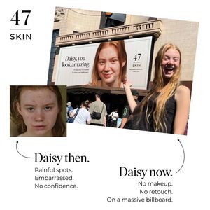 Questo template quadrato per il settore skincare punta tutto su una trasformazione prima/dopo raccontata come “prova nel mondo reale”. Il design usa un fondo bianco pulito, quasi editoriale, e una composizione a collage: un primo piano “then” con imperfezioni visibili, un’immagine “now” più luminosa e sicura di sé, e un mockup di maxi cartellone che rende il risultato pubblico, verificabile, difficile da mettere in dubbio. I titoli in serif (“Daisy then.” / “Daisy now.”) danno autorevolezza, mentre le righe di supporto in sans-serif restano immediate e leggibili. A livello strategico è perfetto per top-of-funnel e pubblico “unaware”: invece di parlare subito di attivi e formule, aggancia con trasformazione e riprova sociale. La promessa “no makeup, no retouch” abbatte lo scetticismo e tocca il pain point emotivo (imbarazzo, poca fiducia). Per personalizzarlo basta sostituire nome, foto prima/dopo e marchio sul cartellone, mantenendo spazio bianco e tipografia per un look credibile e premium.