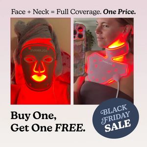Funziona perché unisce due leve tipiche del BOF: dimostrazione visiva immediata e offerta ad alto valore percepito. Il doppio scatto affiancato rende evidente la copertura “viso + collo”, abbassando le obiezioni di chi è già product-aware sulla luce rossa e cerca solo un motivo concreto per acquistare. “One Price” riposiziona il bundle come scelta intelligente, mentre BOGO e bollino Black Friday attivano risparmio e urgenza senza bisogno di spiegazioni lunghe. La tipografia grande è pensata per la leggibilità nello scroll e il bagliore rosso identifica subito la categoria (LED therapy), aumentando lo stop-power. In sintesi: uso reale del dispositivo, promessa di valore chiara e incentivo promozionale forte per chiudere la conversione.