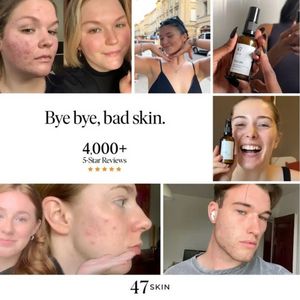 Questo template quadrato per skincare è pensato per vendere un siero anti‑acne/anti‑imperfezioni puntando su riprova sociale e risultati visibili. Il design è un collage pulito: selfie in stile UGC (p...