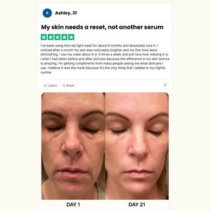 Questo template quadrato per skincare è costruito come una recensione “da piattaforma” abbinata a una prova visiva prima/dopo: perfetto per promuovere una maschera a luce rossa per trattamenti a casa....