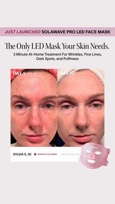 Questo template Story 9:16 è pensato per promuovere una maschera viso LED home-use mettendo i risultati al centro. La banda rosa “just launched” in alto crea subito contesto di novità, mentre il titolo grande in stile editoriale (serif) trasmette autorevolezza e posizionamento premium. Il cuore del layout è il prima/dopo pulito con etichette chiare “Day 1” e “Day 10” e cerchi tratteggiati sulle aree chiave: lo sguardo viene guidato su rughe, rossori, macchie e gonfiore. In basso, la riga “verified customer” aggiunge riprova sociale e abbassa la diffidenza; la nota “results may vary” mantiene il messaggio credibile. È perfetto per una fase di considerazione (MOF) con pubblico già “solution-aware”: conosce i device skincare e cerca conferme rapide e pratiche (“3 minuti a casa”). Il brand può personalizzare finestra temporale, lista di inestetismi, nome/età della cliente e inserire una CTA più evidente senza perdere l’estetica clinica ma premium che genera fiducia.