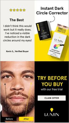 Questo template funziona perché combina tre leve fortissime per un pubblico solution-aware: prova, trasformazione e rischio percepito più basso. Il riquadro prima/dopo rende immediata la promessa visiva di uno sguardo meno stanco, mentre la recensione con cinque stelle e “Verified Buyer” risponde all’obiezione principale (“Funziona davvero?”). Il messaggio “Try before you buy” sposta la scelta da acquisto a test a bassa frizione, perfetto nel mid-funnel di considerazione quando le persone confrontano alternative e cercano conferme. Anche la struttura a griglia è una best practice per lo scroll: headline beneficio, riconoscibilità prodotto, proof e infine un unico bottone d’azione. Il giallo ad alto contrasto guida lo sguardo verso l’offerta senza snaturare il contesto skincare, aumentando propensione al click e richieste di trial.