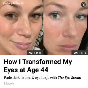 Questo template funziona perché unisce trasformazione e curiosità nello stesso colpo d’occhio: l’utente confronta subito la zona occhi e “vede” cosa cambia. Le etichette “Week 0 / Week 8” sono un segnale di credibilità e impostano aspettative realistiche, fondamentale in skincare dove lo scetticismo è alto. In TOF awareness, con pubblico “unaware”, non serve parlare subito di attivi complessi: il messaggio parte da un racconto personale (“a 44 anni”) e da un beneficio concreto legato ai pain point (occhiaie e borse). L’impostazione pulita, quasi da articolo, riduce l’effetto pubblicitario e fa percepire l’immagine come testimonianza autentica: più attenzione nel feed e più propensione a cliccare per scoprire il prodotto.
