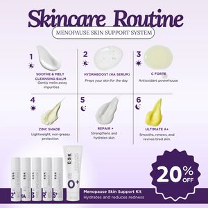 Questo template quadrato promuove un bundle skincare “Menopause Skin Support System” pensato come routine completa. Il design è guidato dal titolo in alto e da una griglia 3x2 che spiega in modo ordin...