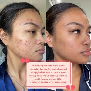 Questo template ad quadrato per skincare punta tutto su una trasformazione prima/dopo pensata per pelle a tendenza acneica. Il layout è uno split-screen pulito con due primi piani in profilo della ste...