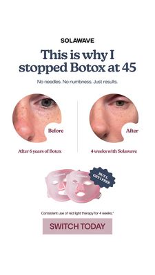Questo template in formato Story promuove una maschera LED per terapia a luce rossa da usare a casa, presentata come alternativa al Botox. L’impostazione è pulita e “editoriale” su sfondo bianco, con ...