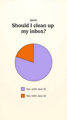 Questo template in formato Story 9:16 promuove un assistente AI per la gestione email con una battuta “da sondaggio” che si capisce in un secondo. Su uno sfondo avorio pulito, il titolo in serif grande chiede: “Should I clean up my inbox?”. La risposta arriva con un grafico a torta enorme: qualunque sia la “scelta”, l’esito è lo stesso (“Yes, with Jace AI”), trasformando l’indecisione in una raccomandazione leggera e memorabile. Il viola/lilla comunica ordine e sollievo, mentre lo spicchio arancione aggiunge contrasto e ritmo visivo, guidando l’occhio verso la punchline. È un’ottima creatività da top of funnel: parla a chi non sta cercando attivamente un tool, ma sente la pressione di una casella piena e del tempo che scappa. Puoi personalizzarla cambiando nome prodotto, palette e domanda (calendario nel caos, note di riunione, task sparsi) mantenendo lo stesso gancio ironico e immediato.