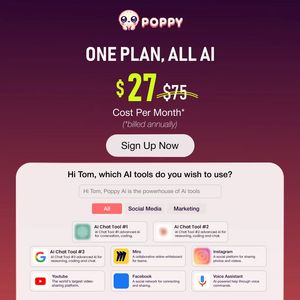 Questa creatività è perfetta per il bottom-of-funnel su un pubblico product-aware: persone che stanno già valutando una piattaforma AI e cercano un motivo chiaro per abbonarsi. Il trigger dominante è il risparmio: il “$27” gigante in lime, accanto al “$75” barrato, sfrutta l’ancoraggio di prezzo e rende l’offerta immediatamente credibile. La comodità viene dimostrata (non solo dichiarata) tramite la griglia stile interfaccia con tab e card, che comunica “tanti strumenti, un solo piano” senza copy lungo—best practice tipica dei bundle SaaS. La gerarchia centrata (claim → prezzo → CTA) riduce lo sforzo cognitivo e guida l’occhio in modo lineare. La nota sulla fatturazione annuale aumenta la trasparenza e riduce le obiezioni prima della conversione, mentre il pulsante arrotondato e pulito favorisce l’azione immediata.