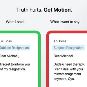 Questo template quadrato è pensato per promuovere un’app di comunicazione per il lavoro che aiuta a scrivere messaggi “a prova di ufficio”. Il layout è pulito e moderno: sfondo grigio chiarissimo, headline centrale molto leggibile (“Truth hurts. Get Motion.”) e poi un confronto in due colonne. A sinistra c’è una finestra stile email incorniciata di verde con la dicitura “What I said”; a destra una versione incorniciata di rosso con “What I want to say”. Il contenuto è una bozza di dimissioni: formale e diplomatica nel pannello verde, schietta e ironica in quello rosso. In pochi secondi fa capire il valore del prodotto: trasformare frustrazione e stress in comunicazione professionale. La strategia è perfetta per awareness: usa humor, immediata riconoscibilità e curiosità. Il codice colore verde/rosso rende il messaggio intuitivo (ok vs. da evitare) e la tipografia grande blocca lo scroll. Funziona con chi vive pressione, micromanagement e burnout leggero, offrendo un momento “mi ci ritrovo” che apre alla soluzione. Si personalizza facilmente cambiando scenario (clienti, HR, team), nome app e colori in linea con il brand.
